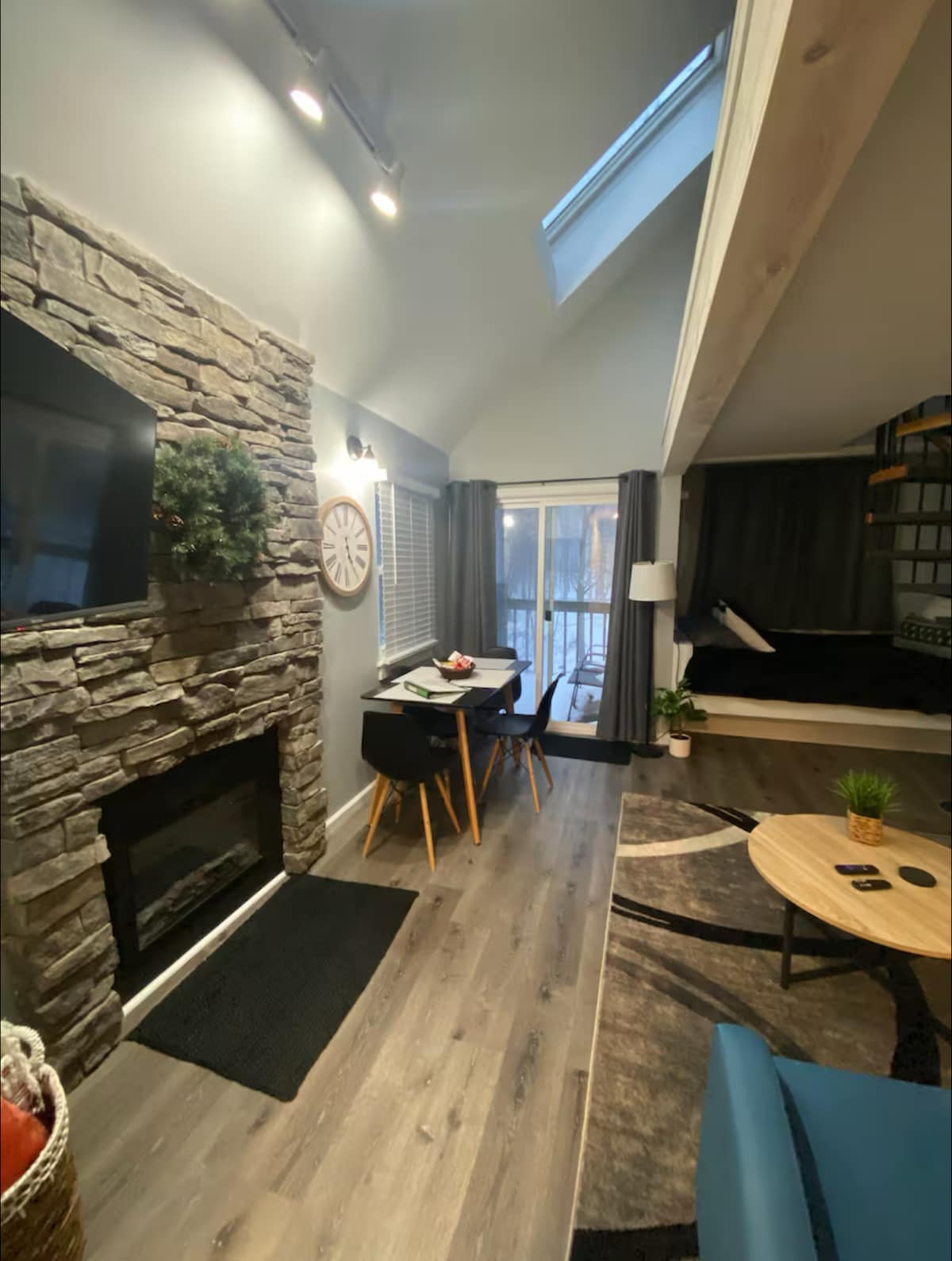 Experience this elegant & cozy condo.Offering a relaxing stay with a loft that sleeps 4 comfortably.Whether it's a day on the slopes, the golf course, or hiking relax and unwind in a peaceful and modern condo setting.Complete with WiFi, fireplace, massage chair, SmartTV, futon,full kitchen, toiletries and more.Common areas includes indoor/outdoor pool, hot tub, sauna, fitness, and tennis.Enjoy the Clubhouse Bar & Grill that is located near the condo for any snacks or delicious meals.Trivia night