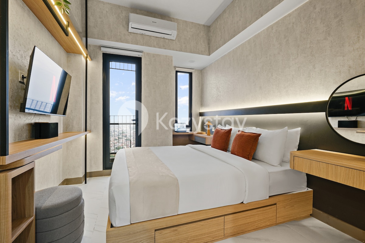 Wifi de alta velocidad. Netflix. ¡Descuento por estancias largas! 🚭 La única suite única en esquina de 2 BR con diseño industrial chic. Ya sea que te quedes por negocios o por fin de semana, garantizaremos tu estancia cómoda. Esta unidad de autoservicio PARA NO FUMADORES ubicada en 32nd fl, con increíble vista al paisaje de Bekasi, carretera elevada MBZ y tren de alta velocidad LRT +. Cuenta con electricidad de 2200 vatios, aire acondicionado, nevera y utensilios de cocina completos para 4 personas. Lagoon Mall se encuentra justo debajo del apartamento. El estacionamiento NO es gratuito.