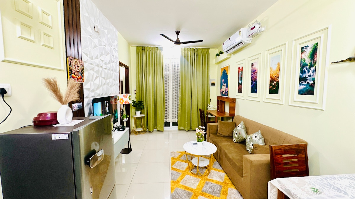 Modern furnished top-floor 1BHK in Balajinagar, Sangli, near Kupwad & Miraj MIDC. Bright living room with large glass window and open views, 55” Smart TV, high-speed WiFi and sofa-cum-bed. Fully equipped modular kitchen, washing machine, bedroom with work desk, hot water and parking. Ideal for corporate stays, couples and small families. Self check-in available.