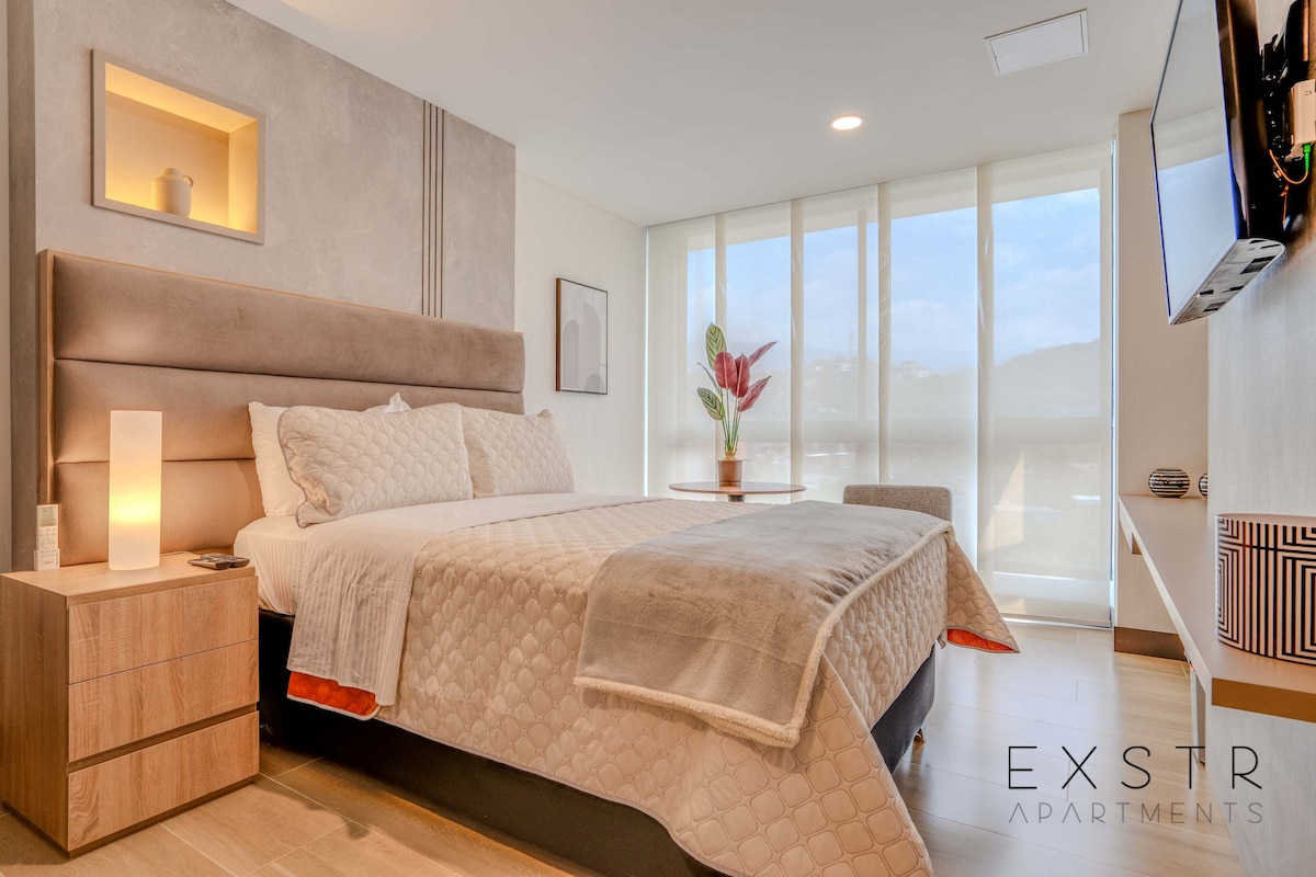 🌴 EXSTR APARTMENT • Riomaggiore 902 🛌 Disfruta de la vista desde el piso 9 de la Torre Riomaggiore. Este moderno estudio ofrece una cama queen, cocineta equipada, SmartTV, aire acondicionado, WiFi rápido y caja fuerte. Camina por el río cercano o descubre la gastronomía de El Peñón. De regreso, disfruta de la piscina, sauna y baño turco con seguridad 24/7, ascensores y parqueadero opcional (costo adicional).