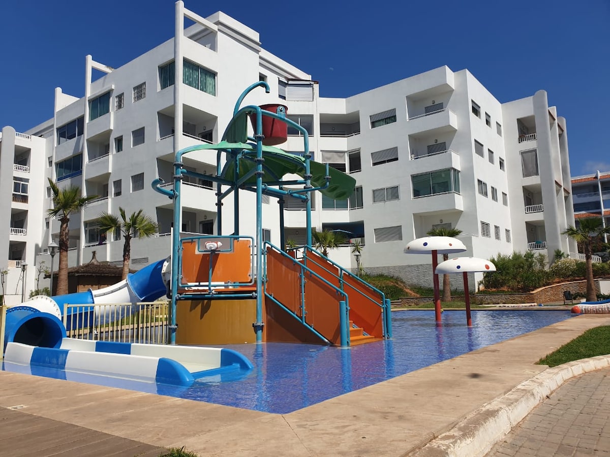 ☀️ Seaside Escape in Bouznika! Luxury 2-bedroom, 2-bathroom apartment at Évasion Bouznika — perfect for families, couples, or friends. Enjoy: 🌊 Sea view & quick walk to the beach 🏊 Direct pool access from your private terrace 🛏️ 2 bedrooms + bright living room 🛁 2 full bathrooms for extra comfort 🍽️ Fully equipped kitchen, WiFi, free parking Located in a calm, secure residence with 24/7 security. ✨ Comfort, sunshine & relaxation guaranteed!