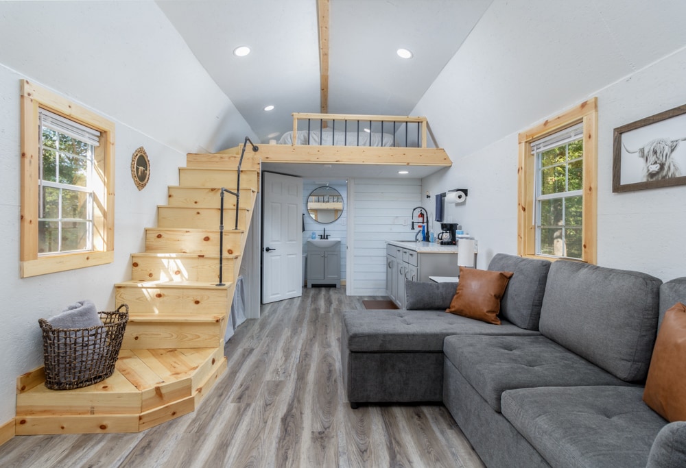 Nestled in the woods, just a quick 5 minute drive to Bennett Spring State Park, this brand new cabin features a full living room, bedroom, kitchen, laundry area, and outdoor fire pit and grilling space. White Pine Lodge is located close enough to several outdoor activities to keep you busy, but off the grid enough to provide some peace and relaxation. There is a full coffee bar, stocked with coffee, tea, and hot chocolate. Queen size bed, full size hideaway. Wi-Fi Internet & smart TVs!