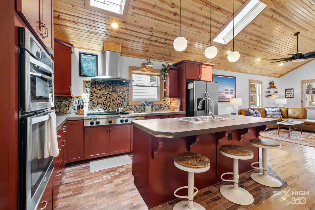 Airbnb n.º 1 de la guía de viajes de★ NWA★ ¡UBICACIÓN perfecta para TODAS LAS COSAS de Bentonville! ¡Sal a pedalear por los senderos o dirígete a los museos desde esta espaciosa y luminosa reforma, a unas manzanas al norte del centro de la ciudad! Llegada autónoma. Decoración moderna y cómoda. 2 dormitorios | 2 baños 1 cama tamaño king Serta iComfort 1 cama tamaño queen 1 colchón hinchable tamaño queen Cocina de chef totalmente abastecida y de calidad profesional. W & D Wifi, Roku, Smart TV TV de 65 pulgadas en el salón TV de 50 pulgadas/dormitorio principal Estacionamiento techado. Espacio con cerradura para guardar bicicletas