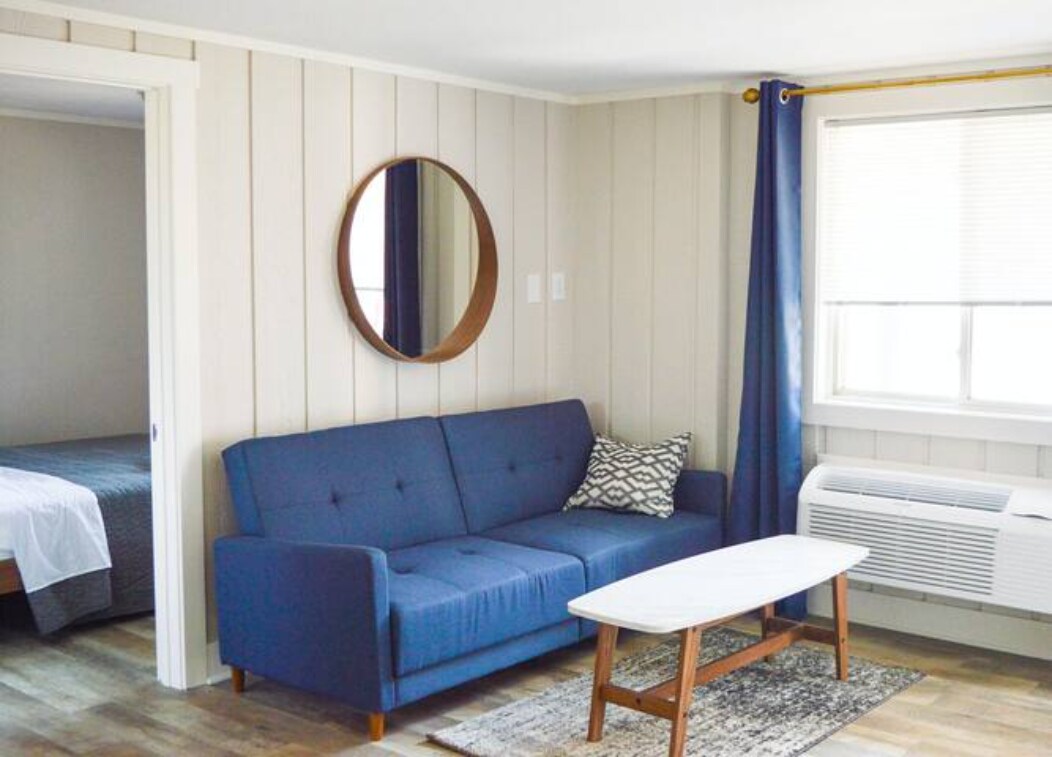 Suite de 2 dormitorios recién renovada en nuestro motel junto al lago con dos camas dobles y baño completo. Esta unidad cuenta con una pequeña cocina de servicio completo, así como una sala de estar independiente con sofá convertible. Todas las habitaciones de nuestra propiedad cuentan con TV por cable, wifi gratuito y desayuno continental. Nuestra propiedad también ofrece un gran patio compartido con parrilla, mesa de picnic, asientos al aire libre y mesa de fuego. Estamos situados justo al lado del lago Crystal, a pocos pasos del pueblo y de la playa de Beulah.