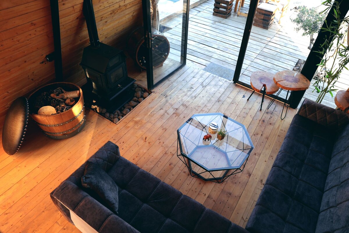 Cozy, private treehouse with outdoor pool, heated indoor hot tub, panoramic views, and smart projector with Netflix. Includes king size bed, full bathroom, kitchenette, BBQ, firepit, hammock, board games, and WiFi. The newest of the four unique treehouses of SEVENOAKS, built on the same land — perfect for couples or friends booking together. Breakfast, wine/cheese platters, and delivery service available. A peaceful escape in nature, just 40 min from Beirut.