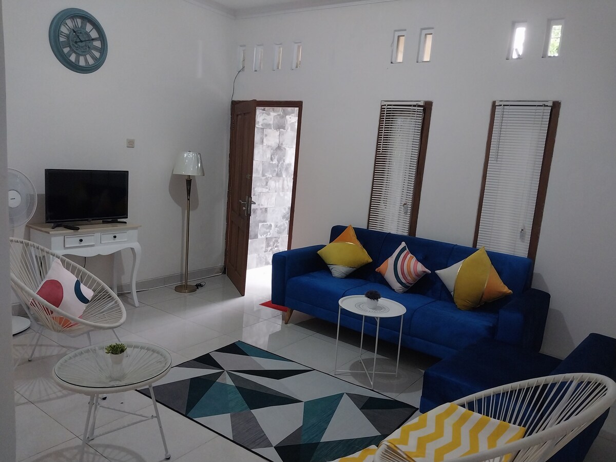 Casa de huéspedes en la zona de Kalasan, cerca de los templos de Kalasan y Prambanan. En medio de un complejo residencial, puedes relajarte con tu familia en esta casa. La zona residencial, que todavía está rodeada de verdes campos de arroz, refrescará tus paseos matutinos alrededor de la casa. Esta casa tiene: - 2 dormitorios principales con camas tamaño queen - 1 sofá cama - Sala de estar con 1 televisor inteligente - Cocina familiar - Terraza - Aparcamiento para 1 coche