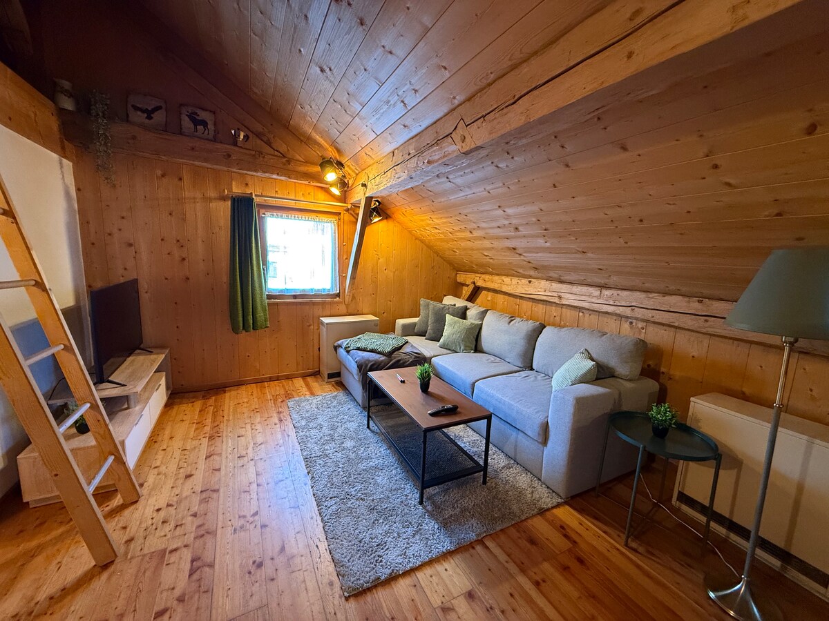Diese wunderschöne Dachgeschosswohnung bietet auf über 50 Quadratmeter Platz für bis zu 4 Personen. Die Wohnung verfügt über: • 2 Schlafzimmer mit jeweils einem Doppelbett und Zugang zum Balkon. • Wohnzimmer mit Kamin, Schlafcouch, Smart-TV, gemütlicher Sitzecke mit Esstisch. • vollausgestattete Küche mit Kaffeemaschine, Toaster und Wasserkocher. • Abstellmöglichkeit für Ski etc. • Carport am Haus für Auto und Mini-Van Bushaltestelle ist 2min zu Fuß entfernt. Skipiste endet hinter dem Haus.