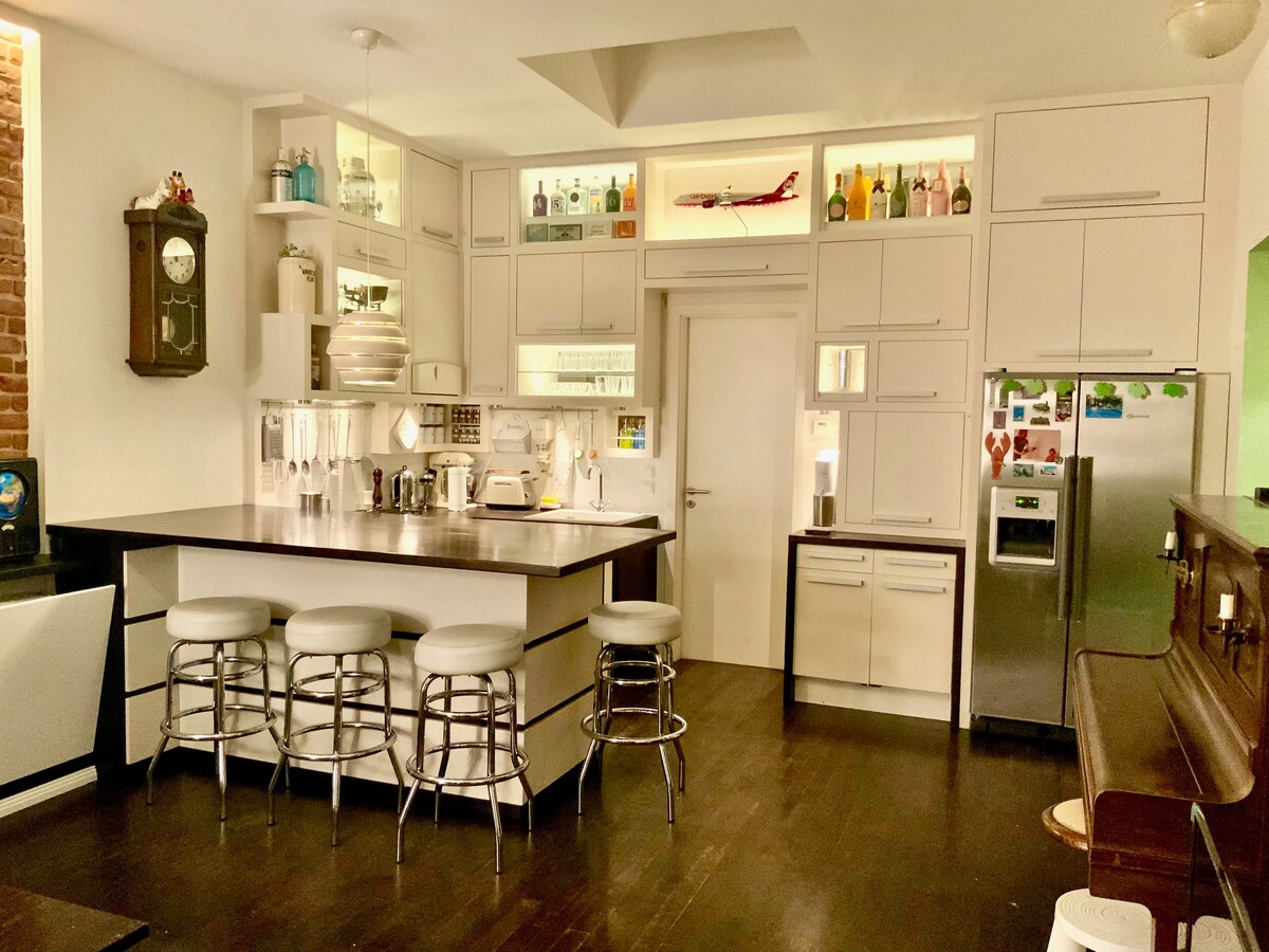 Dúplex de 2 pisos con galería en una ubicación privilegiada de la ciudad 200 m ² 6,5 habitaciones 4 dormitorios. 2 baños Tiene un ascensor Terraza en la azotea y balcón orientado al sur Sauna Se puede dividir en 2 departamentos separados Dormitorios tranquilos al patio Ideal para grupos, eventos, sesiones de fotos, filmaciones - Cafetera de café. -Caja de baño - Lavadora y secadora -4 TV inteligente grande. - Espacio de trabajo en el escritorio. - Mesa de tenis de mesa. PARA RESERVAS DE MENOS DE 3 NOCHES DURANTE EL FIN DE SEMANA, SE DEBE PAGAR UN RECARGO. POR FAVOR, ARREGLA