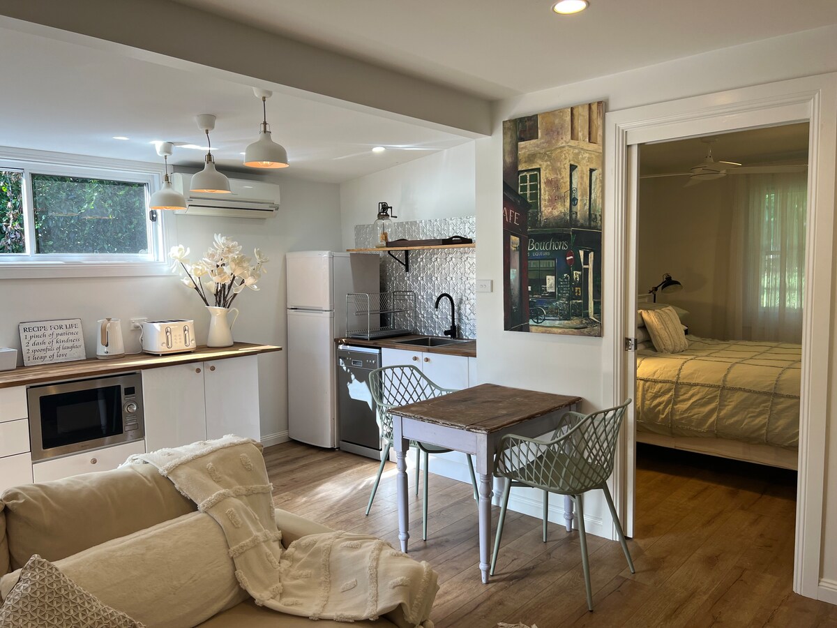 The Nest is a peaceful & private self-contained space, tucked away at the back of the property, and only a 5 minute stroll into town. All ground level, the Guest Apartment has its own private entrance, and consists of two spacious areas. The main lounge room is a large open plan space with kitchenette - including tea & coffee making facilities - then a separate generous sized bedroom with Queen bed and renovated ensuite bathroom. Pet friendly with fully enclosed fence.