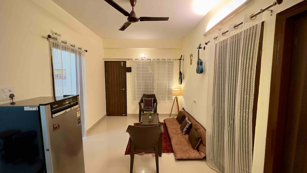 1BHK Airbnb en Bittan Market, Bhopal Sala de estar: sofá acogedor, mesa central, escritorio y silla de oficina, TV, plantas Dormitorio: cama tamaño king, espejo de pared completa, amplio espacio de almacenamiento, aire acondicionado Cocina: nevera, microondas, hervidor, inducción, cubiertos y utensilios, purificador de agua Lavabo: moderno con artículos de aseo incluidos Zona al aire libre: asientos relajantes con una mesa de centro Electrodomésticos: lavadora, microondas, nevera, hervidor, inducción, aire acondicionado, TV, WiFi