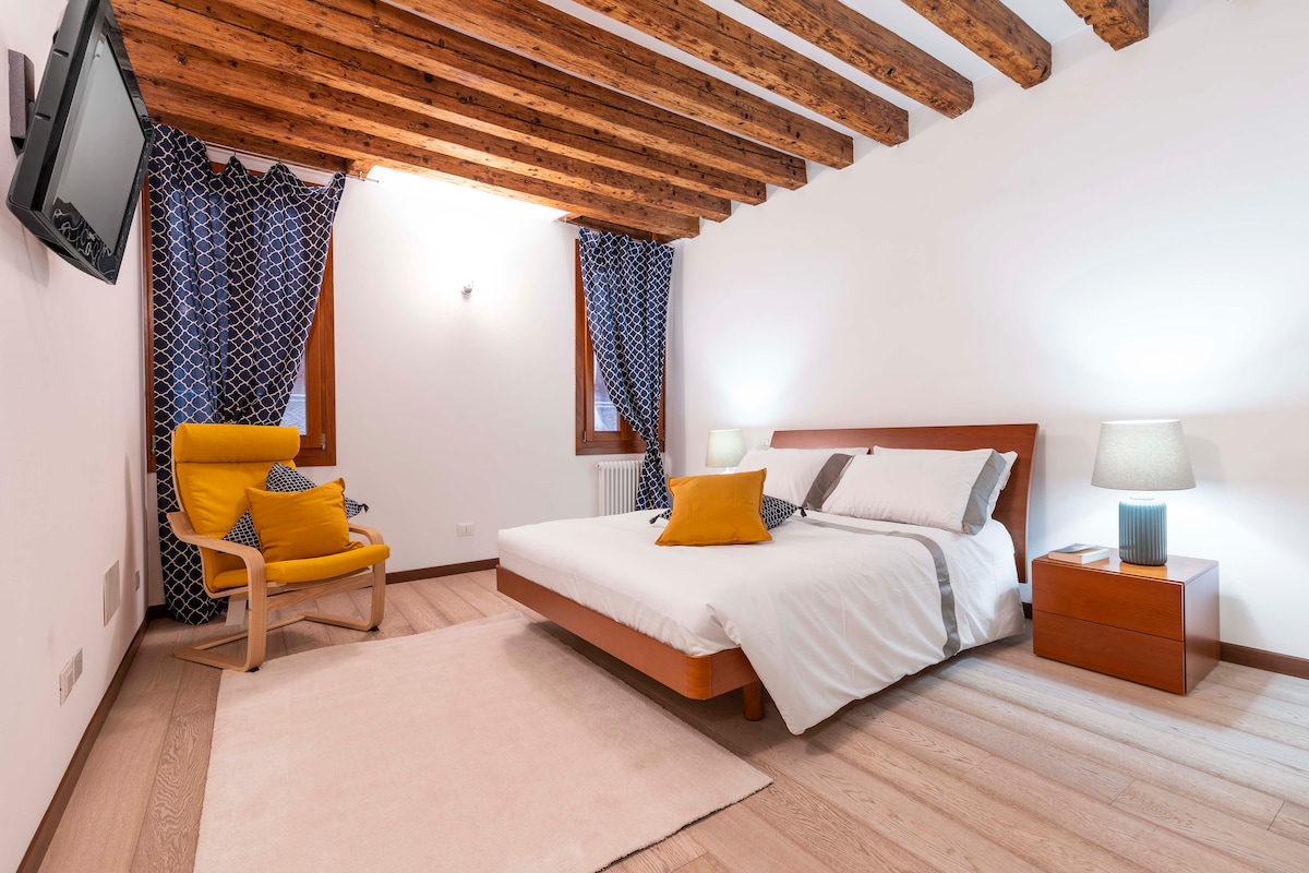 Spacious apartment, 90 square meters, in the heart of Venice, 2 spacious bedrooms, 2 complete bathrooms with shower, full kitchen, FIBER wi-fi and air conditioning. First floor (no ground floor, just one flight of stairs). Furnished with custom made in Italy furniture, luxury finishes, high ceilings. Ideal for a leisure or business stay. 7 minutes walk from San Marco and Doge's Palace, 13 minutes walk from Rialto. 7 minutes walk from the Biennale Arsenale. One minute from San Zaccaria.