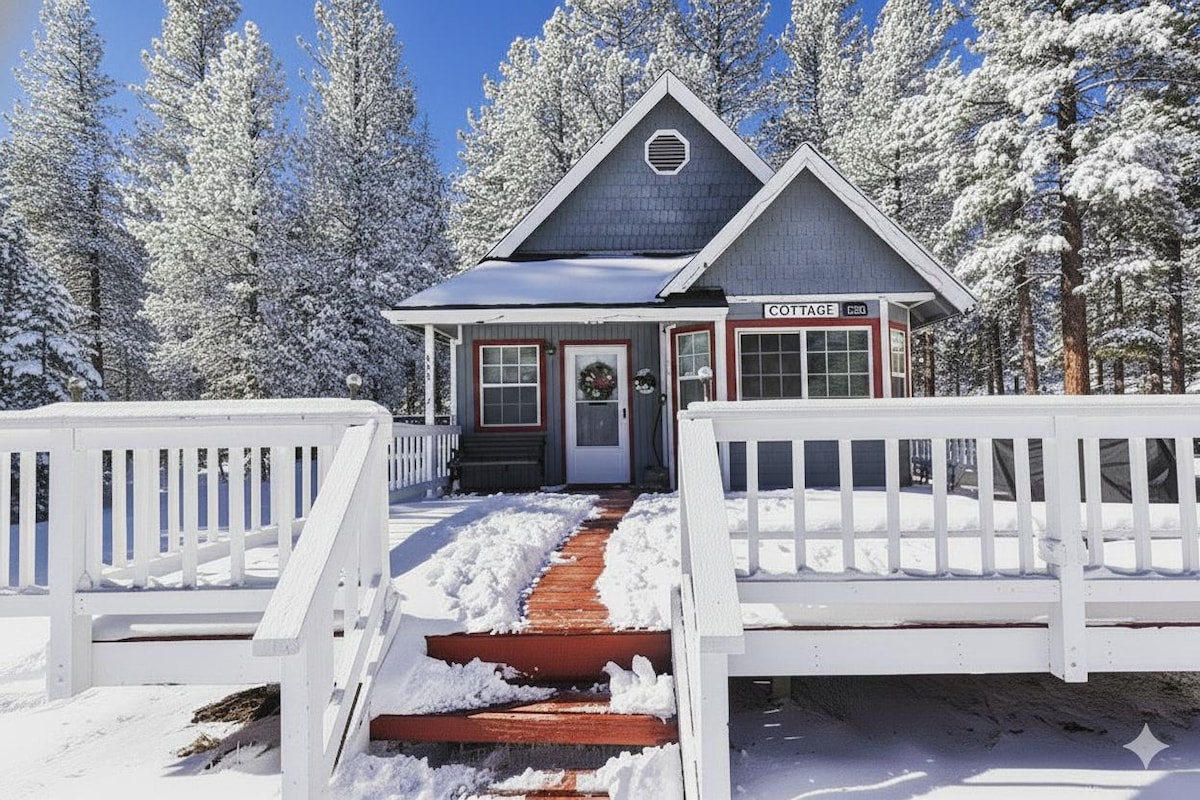 Licencia n.º VRR-2025-0871 Código wifi> rocketbasket147 < ¡Una casa rural romántica de cuento! Dormitorio queen, un acogedor sofá cama (tamaño completo), calefacción central, aire acondicionado, TV, DVD, micro, cafetera y licuadora. Chimenea de gas. La barbacoa de gas y la plancha en el porche son ideales para cocinar huevos y tortitas crujientes en las mañanas de montaña. ¡Se admiten mascotas/patio vallado! Muy cerca (a poca distancia a pie) del lago y del pueblo que admite perros. ¡La acogedora y acogedora casa de campo vintage «Ahhhdorable» será perfecta para una visita a Big Bear!