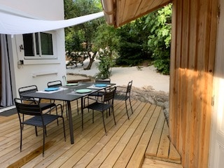 Departamento en primera línea de la Bahía de Arcachon, entre el mar y el bosque. Las chaquetas de la península de Cap-Ferret. En el primer piso de una casa de madera de 2013, en un camino privado. Acceso directo a la playa. Aire acondicionado con todo el confort 60 m². 1 dormitorio cama Queen-size colchón de látex natural, baño, inodoro, lavadero lavadora, equipo BB, secadora, gran sala de estar-cocina con 1 cama-armario Queen-size. Cocina equipada con horno eléctrico, placa de inducción, microondas, lavavajillas, heladera. TNT WIFI.