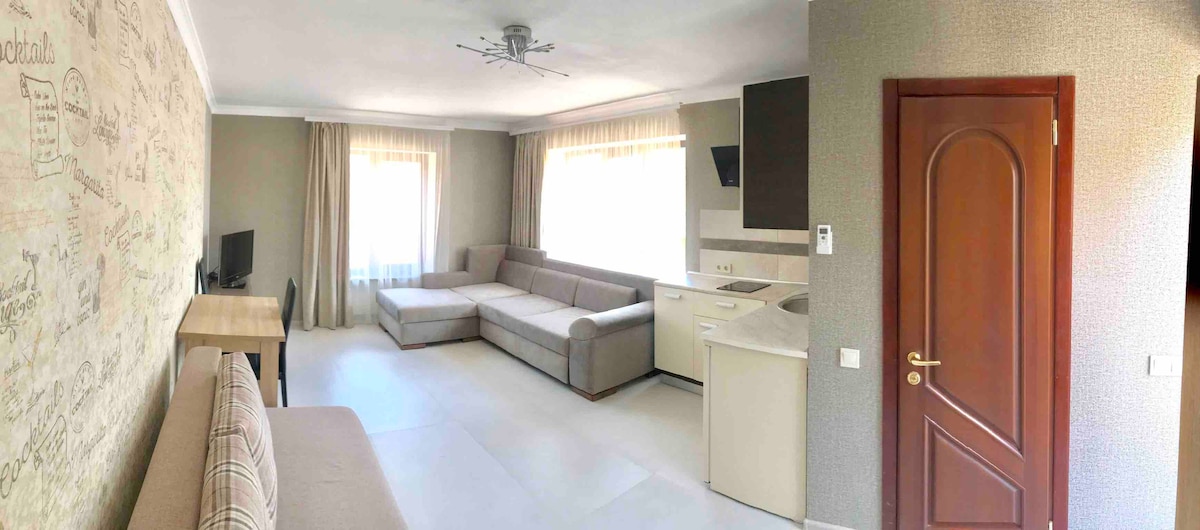 Me complace presentarte un departamento con una vista magnífica de la ciudad y el mar. El apartamento cuenta con todo lo que necesitas para una estancia cómoda de 3-4 personas. Una cama grande y un sofá plegable grande. El departamento está ubicado en el corazón de la ciudad. En el acogedor patio hay un estacionamiento y una plaza. A pocos pasos hay tiendas, bazares, cafés y restaurantes. La playa de la ciudad está a 10 minutos a pie.