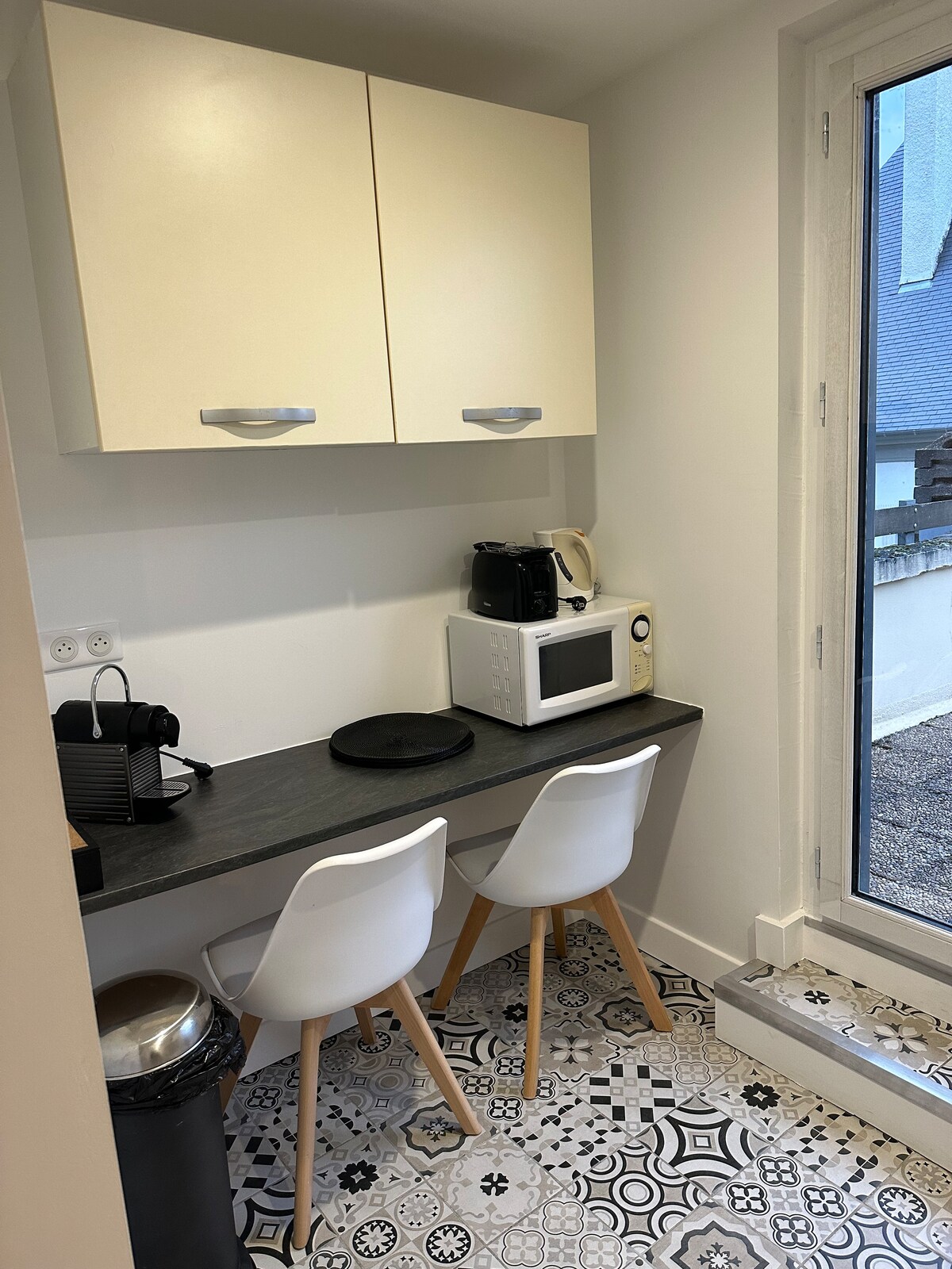 Estudio de PRIMERA, HIPERCENTRO PAU: barrio del Castillo con VISTAS A los Pirineos, amueblado y renovado con buen gusto AIRE ACONDICIONADO REVERSIBLE Tercer piso APARCAMIENTO GRATUITO de 18:00 a 9:00 a 1' -coin TERRAZA: 2 grandes pufs fatboy, zonas de estar relajantes y comidas -esquina de cocina: nevera/placas/microondas/máquina Nespresso/tostadora/hervidor de agua/vajilla utensilios de cocina - zona de comedor con sillas -esquina sala de estar-noche: cama armario que hace sofá/TV 80'/almacenamiento/mesa de centro y sillas -SDB:ducha italiana/inodoro