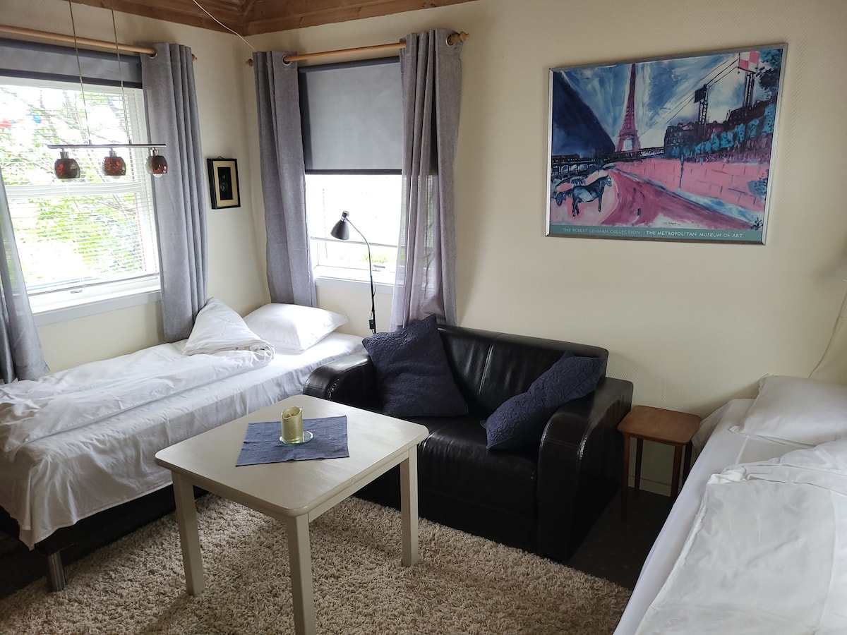 Dette bostedet er helt unikt. 4 min med taxi fra flyplass/heliport. Kompakt minihus God restaurant på Thon hotell 60meter gange Det meste av kjøkkenutstyr.