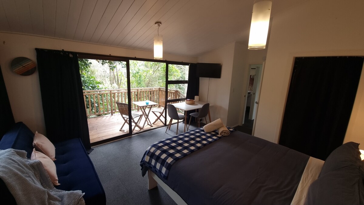 Just 15 minutes to the CBD and beautiful beach walks in the street, this location is ideal for your Auckland stay. With a modern bathroom and fully equipped kitchenette (note - no stovetop) you will have the flexibility to eat out or in while enjoying our peaceful back yard views and the king-size bed. We offer fast fibre WIFI as well as a selection of breakfast cereals and off-street parking. Lock-box check-in means you will have complete privacy to come and go when it suits.