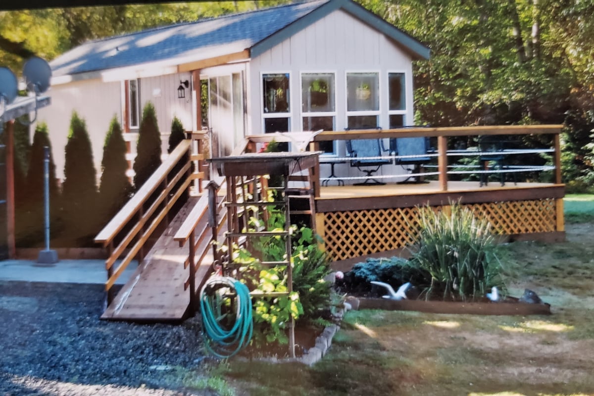TOTAL PRIVACY.....small, fully furnished Park Model guest house with an electric fireplace, a TV in the bedroom( queen size bed) as well as a TV in the living room, a small Charcoal Bar-B-Que available, on a 5 acre area across the drive way from a private home , 5 miles from downtown Port Angeles. Beautiful landscaping with a trout pond, large yard, in season berries on the bushes, produce in the garden, fresh eggs in the chicken coop and catch and release trout fishing.