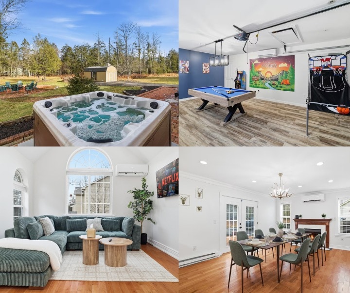 Escape to Bear Rock on Birch — a private Pocono retreat backing to State Game Lands. Soak in the hot tub under the stars, gather around the firepit, or relax by the fireplace after a day at the slopes or lake. This modern 4BR, 2.5BA home sleeps 8 and is dog-friendly. Enjoy the king suite, open layout, and wraparound deck surrounded by trees. Minutes to skiing, hiking, and dining — perfect for a cozy winter escape or spring reset.