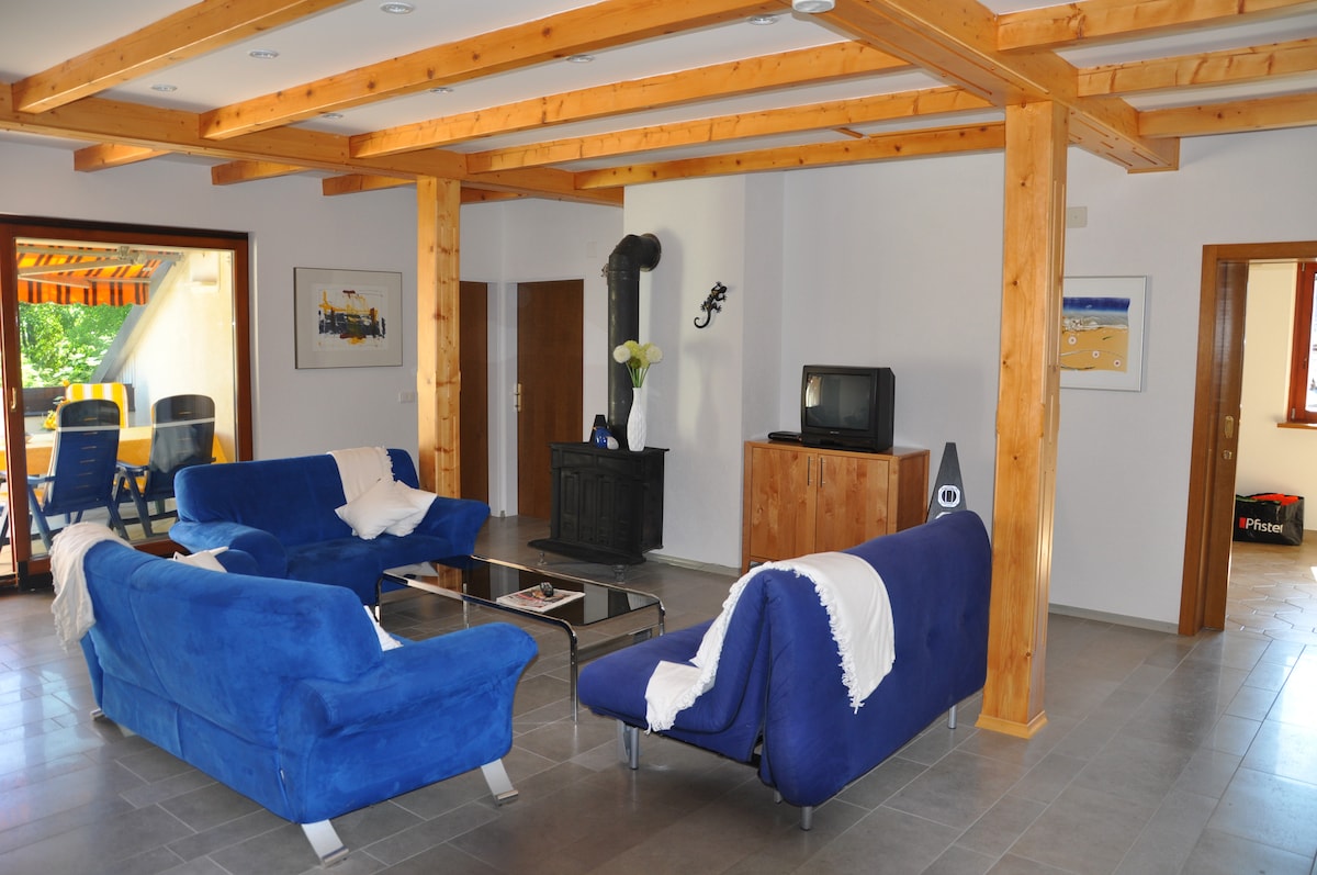 El apartamento es para 4+1 personas y tiene un dormitorio con cama doble (cuna, cambiador y bañera para bebés a pedido) y todo en una cocina comedor/sala de estar con una litera y una cama de invitados plegable, dos baños, un balcón y un gran jardín con una barbacoa (compartida). El departamento es muy espacioso. El aire acondicionado de refrigeración y calefacción está incluido. El impuesto turístico está incluido en el precio por noche. El precio por noche incluye 4 personas. 1 persona adicional es de 15 EUR por noche.