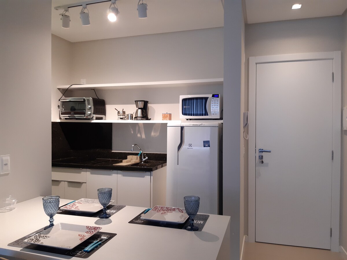 Sofisticado apartamento tipo estudio ubicado a 800 metros del parque Vila Germânica, lugar de eventos como el Oktoberfest. Rodeado de restaurantes, bares y supermercados. Todo para su comodidad: Smart TV 50" Samsung, aire acondicionado split, ducha de gas, wifi fibra 240mb, cocina completa con heladera Brastemp, microondas, horno, estufa, campana extractora, cafetera, purificador de agua, lava y seca, armarios, y por supuesto ¡una cama queen con el mejor colchón!