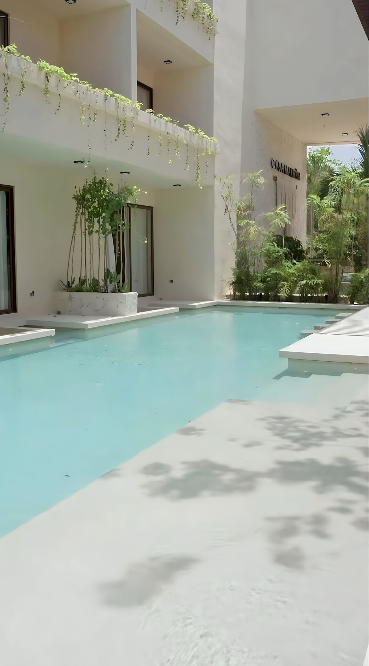 ¡Esta es una verdadera casa de lujo, nueva en Airbnb y con descuento! Amplio y elegante apartamento de 2 dormitorios con un auténtico aspecto boho en el segundo piso de un exclusivo edificio boutique. La experiencia perfecta en Tulum. Situado en el corazón de Tulum, Aldea Zama, está a 8 minutos de las espectaculares playas. Disfruta de la terraza en la azotea con piscina infinita, jacuzzi y tumbonas. El apartamento cuenta con una cocina totalmente equipada, amplios patios, 3 baños, TV inteligente, aire acondicionado, wifi rápido (90 Mbps), mesa de comedor grande y personal de seguridad.