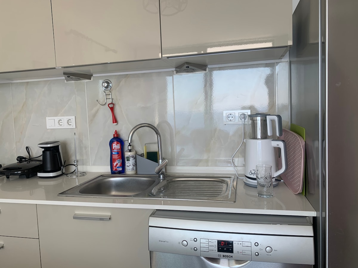 Es un apartamento donde puedes alojarte tanto en el corazón de la ciudad como lejos del ruido en Bodrum "Gumbet". Tiene una gran terraza con vistas al salón, cocina, dormitorio, baño, aseo y sofá. El apartamento tiene un sofá que puede ser una cama, una nevera, una lavadora, una estufa de 4 quemadores, aire acondicionado (frío-calor), conexión Wi-Fi de agua caliente constante, una mesa de comedor para 4 personas, TV, hervidor de agua, utensilios básicos de cocina. A poca distancia se encuentran restaurantes, supermercado, estación de taxis, farmacia, centro comercial Oasis.