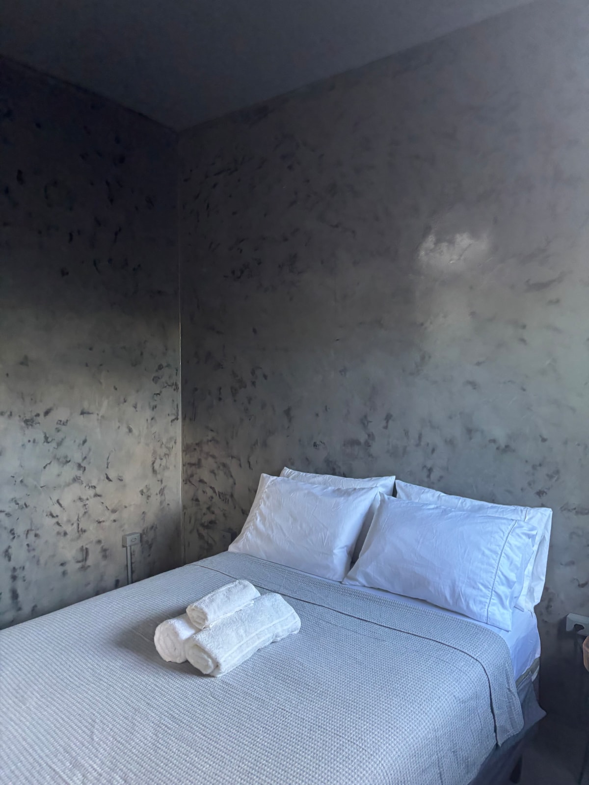 A suite 3 tem uma cama casal e banheiro privativo e cortinas. O quarto oferece ventilador de teto, ar condicionado, frigobar, copos, taças, abridor de vinho, prateleiras e entrada individual. O quarto possui um espaço novo com colchões de espuma D45 e molas ensacadas.