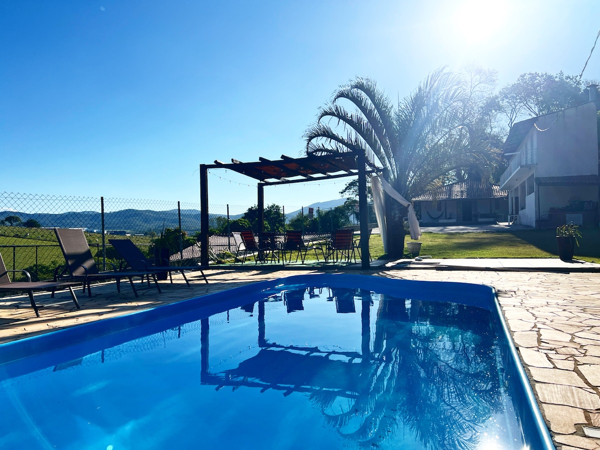 Granja con piscina climatizada y parrilla, excelente espacio para descansar con la familia, casa muy espaciosa, con cinco dormitorios, dos de ellos suites. La casa tiene una vista maravillosa, ya que se encuentra en una parte más alta del barrio. Cuenta con un amplio garaje con capacidad para 4 coches.