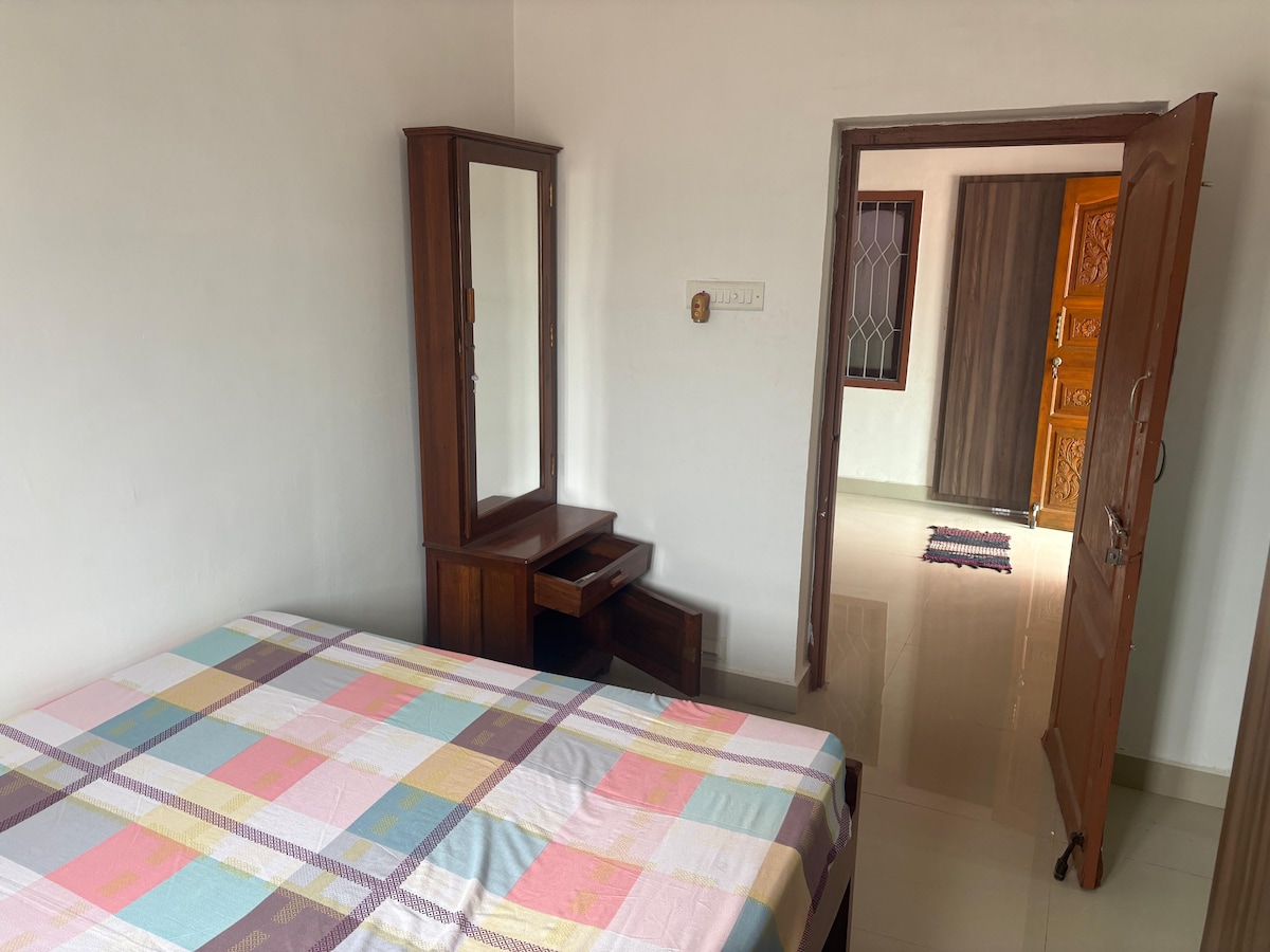 Relájate en este espacio tranquilo y elegante. Es una villa de una habitación con estacionamiento y área de césped privada y muro compuesto para tu seguridad y privacidad. Disfruta del entorno verde a solo 1 km de ECR. A 4 km de la playa de rocas. Respaldo de energía las 24 horas. Ofrecemos proyector para aumentar tu entretenimiento en pantalla grande, agua de lluvia. Fácil acceso a la playa y la ciudad blanca. Más preferible para parejas con niños. (solo no se permiten hombres) Se permiten dos adultos y dos niños. (No se permite fumar dentro de la habitación)