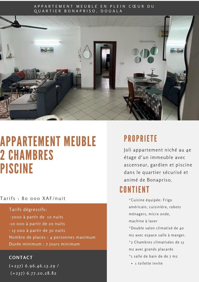 En Bonapriso, villa segura con piscina compartida, 2 habitaciones, grupo electrógeno, estacionamiento para 3 coches, portero. Ideal para estancias en pareja, en familia o profesional en Douala. A 5 minutos del aeropuerto internacional de Douala. Además, ofrecemos varios servicios como limpieza diaria, cocina, cuidado de niños, coche con conductor, etc. No se permiten fiestas. No dudes en enviarnos un mensaje privado para más información
