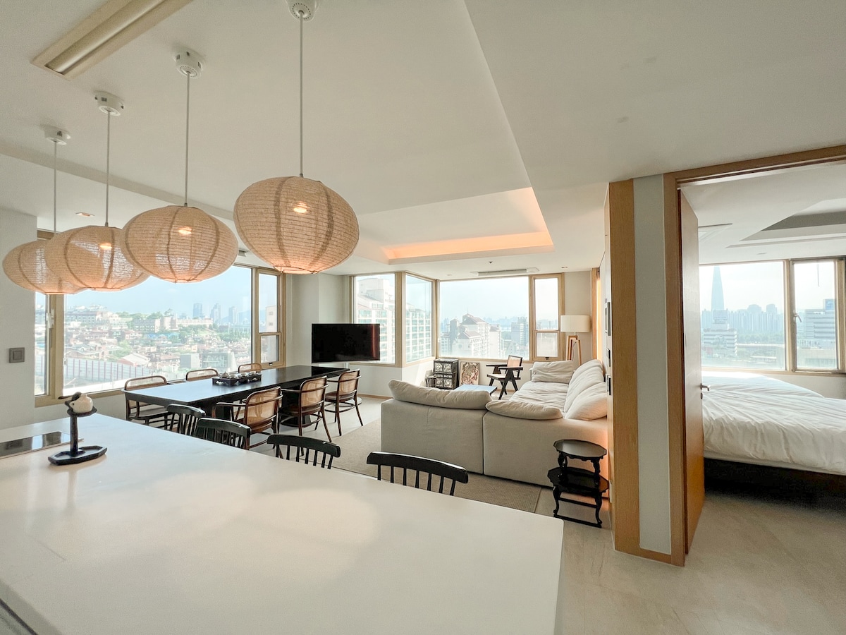 Fully renovated and cozy penthouse apartment with great views of Seoul. Don't miss the one from the hinoki bath. Portable WiFi provided. Great location in trendy Gangnam, one of the busiest districts of Seoul, blending modernity and tradition... Right out of Subway line n. 9 Bongeunsa station with Bongeunsa temple, Coex Mall and SM Town literally at your doorstep. 강남 도심과 한강, 그리고 녹음과 전통의 미가 어우러진 봉은사까지 파노라마 뷰를 즐길 수 있는 펜트하우스입니다. 고급 자재를 사용해 풀리노베이션하여 모던하고 쾌적합니다. 히노끼욕조에서 도심 노천탕 분위기 속에 피로를 풀어보세요.