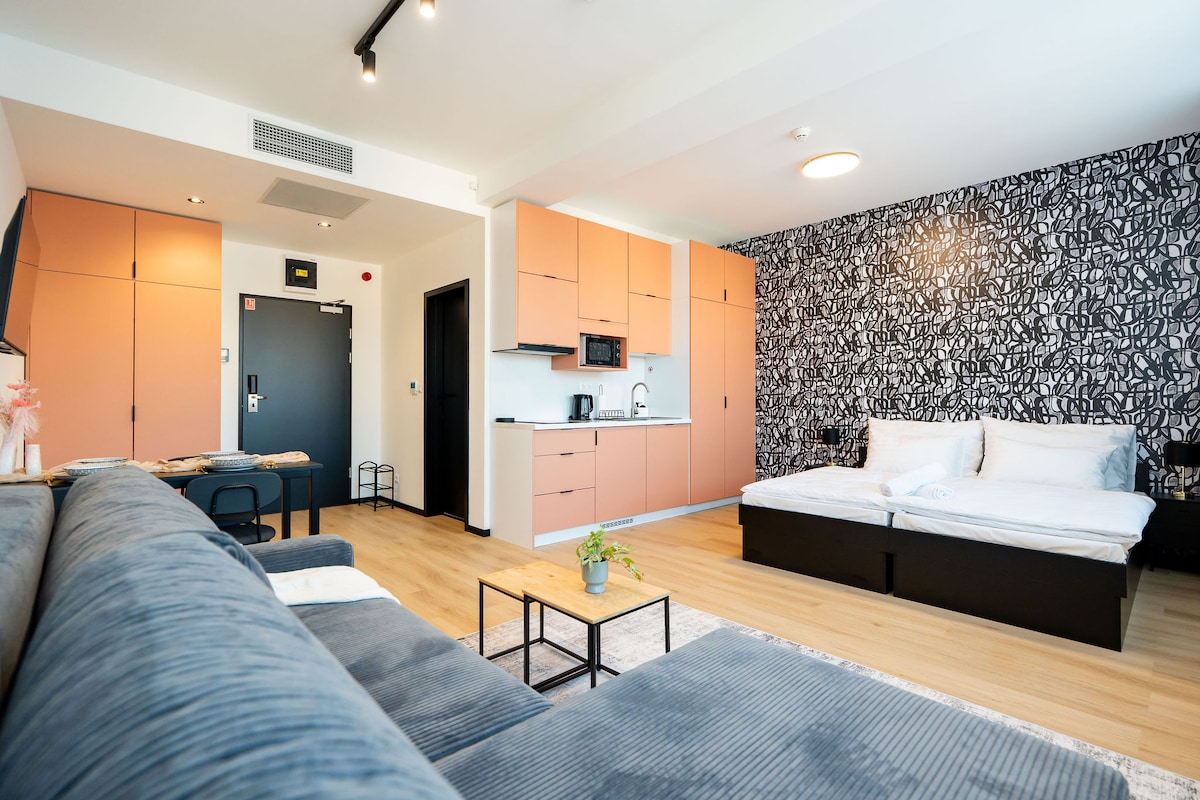 A solo unos pasos del spa y a 10 minutos a pie del centro de la ciudad, puedes vivir en el corazón de la ciudad. El apartamento cuenta con una pequeña cocina, baño y un dormitorio con cama doble (140x200 cm). Se encuentra en el décimo piso (el ascensor solo sube hasta el octavo piso).