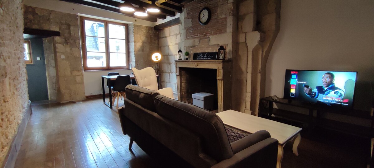 Encantador apartamento del siglo XVI de 70 m2 ( 93 m2 en el suelo ) tipo loft situado a 20 m de la plaza Gordaine en el centro de la ciudad de Bourges. Alojamiento amueblado de turismo clasificado con 3 estrellas. Está equipado con aire acondicionado reversible, estufa de pellets y tiene un patio privado. Situado en el 1.º piso sin vecinos y muy tranquilo (en la parte posterior de la animada calle), una panadería se encuentra frente a la puerta y muchos restaurantes cerca. Tarifa adaptada al número de viajeros. (+ 20 € por noche a partir de 2 viajeros)