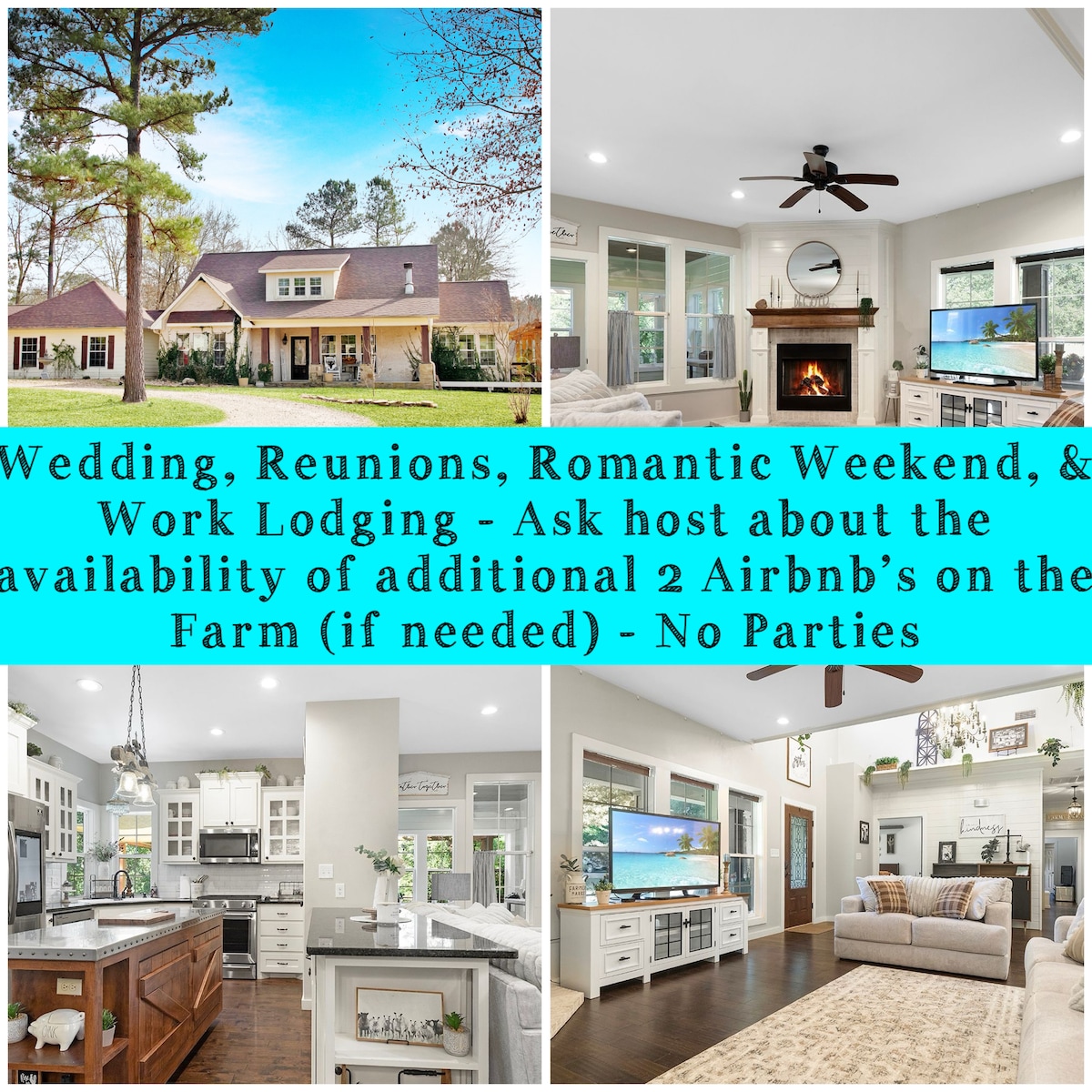 Cozy hallmark movie style farm stay, minutes from Texarkana. Living room with fireplace, bright sunroom/greenroom for work, and an open kitchen with a stainless steel island. Three bedrooms, two baths, primary suite with soaking tub and laundry access; guest bath with tub/shower. Outside: fenced yard, pergola swing, deck, swing set, goats next door, 5 televisions, and fire pit. Max 6 guests at all times. No pets-to keep livestock safe. Registered guests only. No parties, visitors, or events.