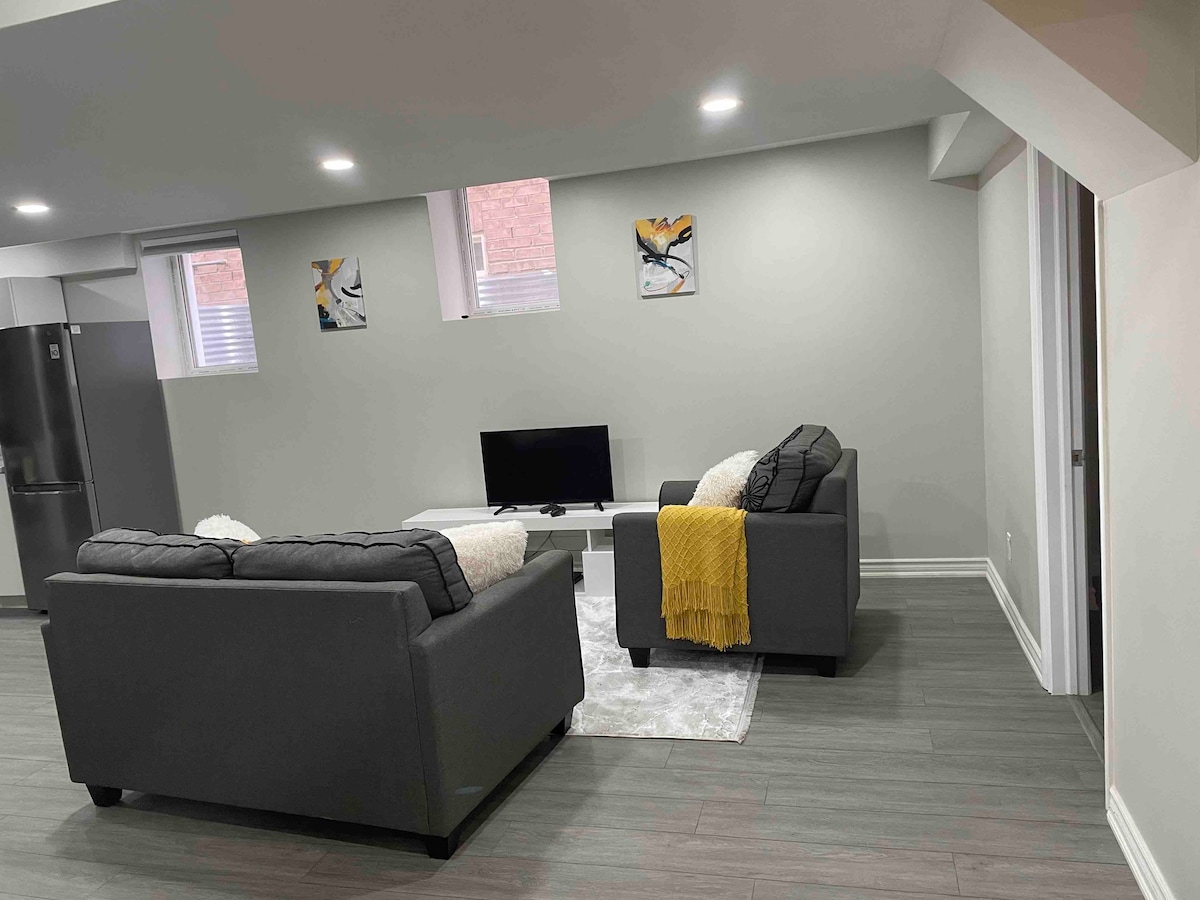 ¡Bienvenido a tu hogar lejos de casa! Este sótano tiene una entrada privada y es de nueva construcción, con un baño completo y utensilios de cocina, una amplia sala de estar, comedores interiores y exteriores y un cómodo dormitorio. Disfruta de comodidades modernas como wifi y un televisor de 50 pulgadas con una suscripción a Netflix totalmente pagada. Tu comodidad es nuestra prioridad, con una plaza de aparcamiento designada en la entrada para los huéspedes. Muy cerca se encuentran restaurantes populares como Swiss Chalet, DQ, etc.