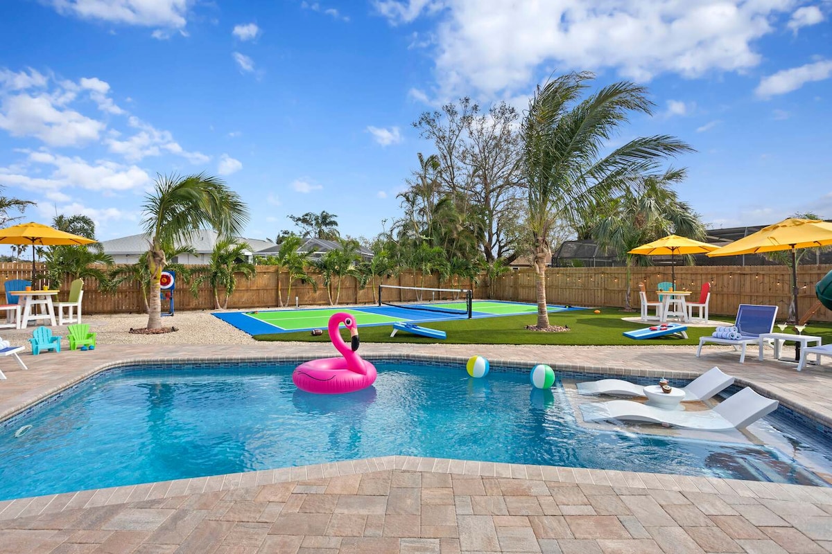 Alojamiento vacacional con piscina y pickleball, a 9 minutos de la playa