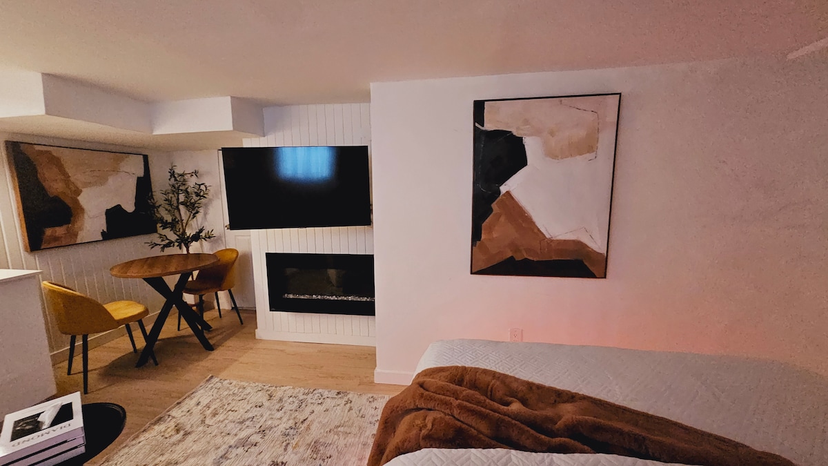 Sumérgete en el lujo y siente una sensación inmediata de serenidad y paz en este estudio único. Aspecto de diseño con decoraciones y acabados mejorados. Baño cuidadosamente diseñado: luces LED de espejo de maquillaje. Equipado con microondas Bosch, Nespresso, chimenea Napoleón románticamente acogedora, encimera, mininevera, utensilios. Aeropuerto 10, Toronto DT 30, Niágara 90, centros comerciales y muchos restaurantes a 2 minutos en coche. Todo se mantuvo en perfectas condiciones y esperando tu llegada. NO FUMAR/MASCOTAS