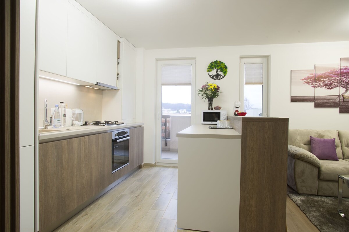 Ubicado en un vecindario nuevo, cerca del mejor centro comercial de Brasov, Coresi Shopping Resort. Aquí puedes disfrutar de una gran variedad de restaurantes, tiendas, un moderno spa y un gimnasio. El hermoso casco antiguo de Brasov se encuentra a solo 10 minutos en auto. Las pistas de esquí de Poiana Brasov están a 25 minutos en auto. Hay un lugar de estacionamiento gratuito disponible frente al edificio. La estación de autobuses al centro de la ciudad está a solo 3 minutos a pie.