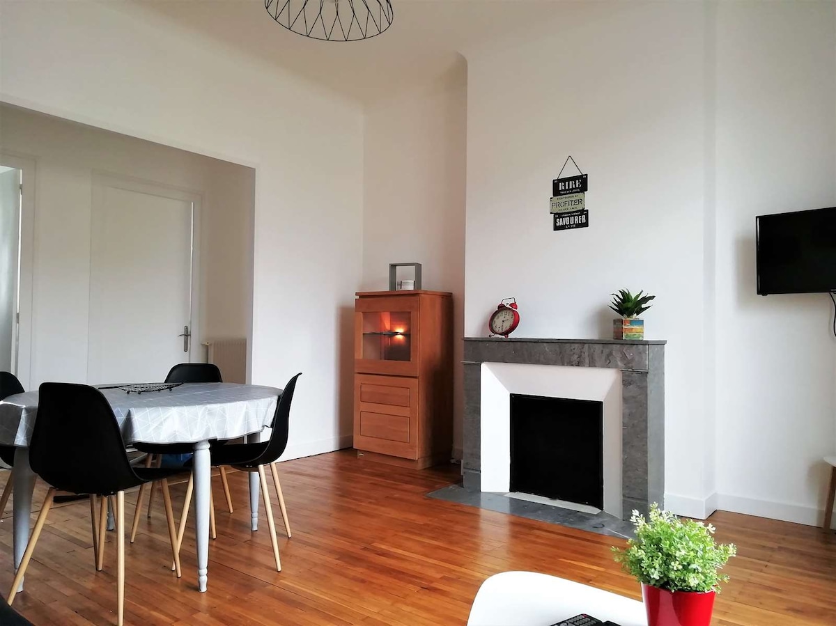 En un pequeño edificio tranquilo del siglo XIX, situado lo más cerca posible del centro. Frente al Loira, el 18, en el primer piso, le da la bienvenida en un ambiente MUY LUMINOSO con materiales auténticos Sus 60 m² bajo una hermosa altura de techo le encantarán para sus cómodas estancias en familia, en pareja, con amigos o profesionales con su cocina totalmente equipada, su wifi de alto rendimiento y su aparcamiento gratuito al lado del edificio Disfrute de su situación privilegiada