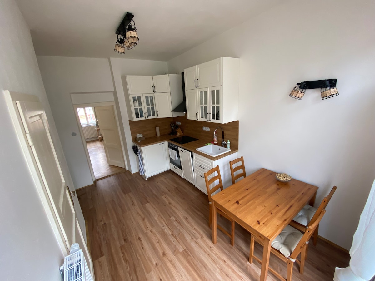 The new air-conditioned attic apartment features a double bed and a sofa bed that provides two additional sleeping areas. Includes a fitted kitchen, bathroom with shower, washing machine, hairdryer and iron. The whole apartment is covered with high-speed wifi. Cable TV is available, including HBO. Nearby is the restaurant Svatoboj, food, a popular cycle path with beautiful nature and one of the best wellness in Brno - 4comfort. We offer self-check-in!