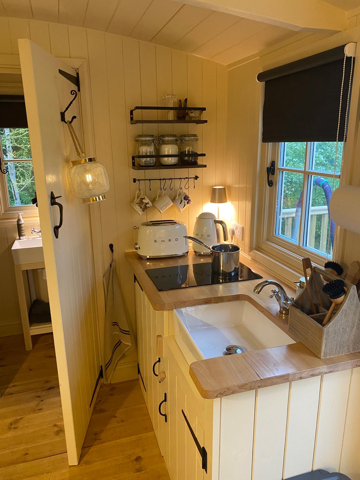 Nuestra auténtica cabaña elevada está enclavada entre los árboles y situada dentro de su propio huerto privado, bordeado por un arroyo balbuceante. Un lugar perfecto para escapar de todo. Hay mucho espacio exterior cubierto para pasar las noches inmerso en la naturaleza y, para una verdadera experiencia al aire libre, prueba la cocina de fuego abierto con el horno holandés y la barbacoa colgante. Lo mejor de todo es sumergirse en los baños gemelos privados con vistas al arroyo. Solo tienes que añadir una copa de champán para vivir una experiencia inolvidable.