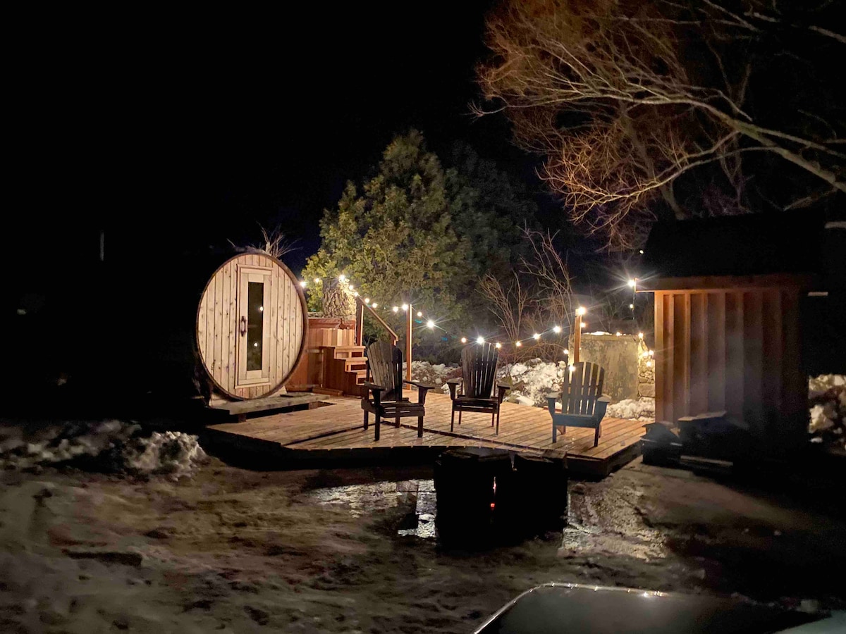 Escondido frente a la orilla del lago Huron, ubicado en un área de conservación serena, The Morhaven ofrece un espacio privado, tranquilo y acogedor para relajarse. Comienza el día con una caminata tranquila a través de nuestro sereno bosque. Dirígete a la playa (2 minutos en auto) para nadar. Relájate con una relajante sauna y spa de agua salada. Al caer la noche, remar por las tranquilas aguas, viendo nuestros atardeceres de clase mundial. Termina la noche junto a la fogata crepitante, bajo un cielo iluminado por las estrellas. Perfectamente situado para explorar The Bruce.