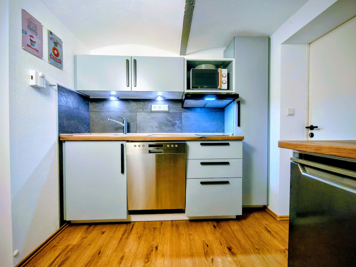 Genießen Sie Ihre Zeit in unserer stil- und liebevoll eingerichteten Ferienwohnung. Unsere Wohnung verfügt über einen offenen Wohn-/Essbereich mit Kochnische, einen abgetrennten Schlafraum und ein Badezimmer mit Dusche. Die Kochnische ist ausgestattet mit Geschirrspüler, Herd, Kühlschrank (+Eisfach) sowie einer Kaffeemaschine. Im Schlafzimmer finden Sie ein bequemes Doppelbett 140cm und einen Kleiderschrank vor. Ein weiterer Schlafplatz steht Ihnen auf der Schlafcouch zur Verfügung.
