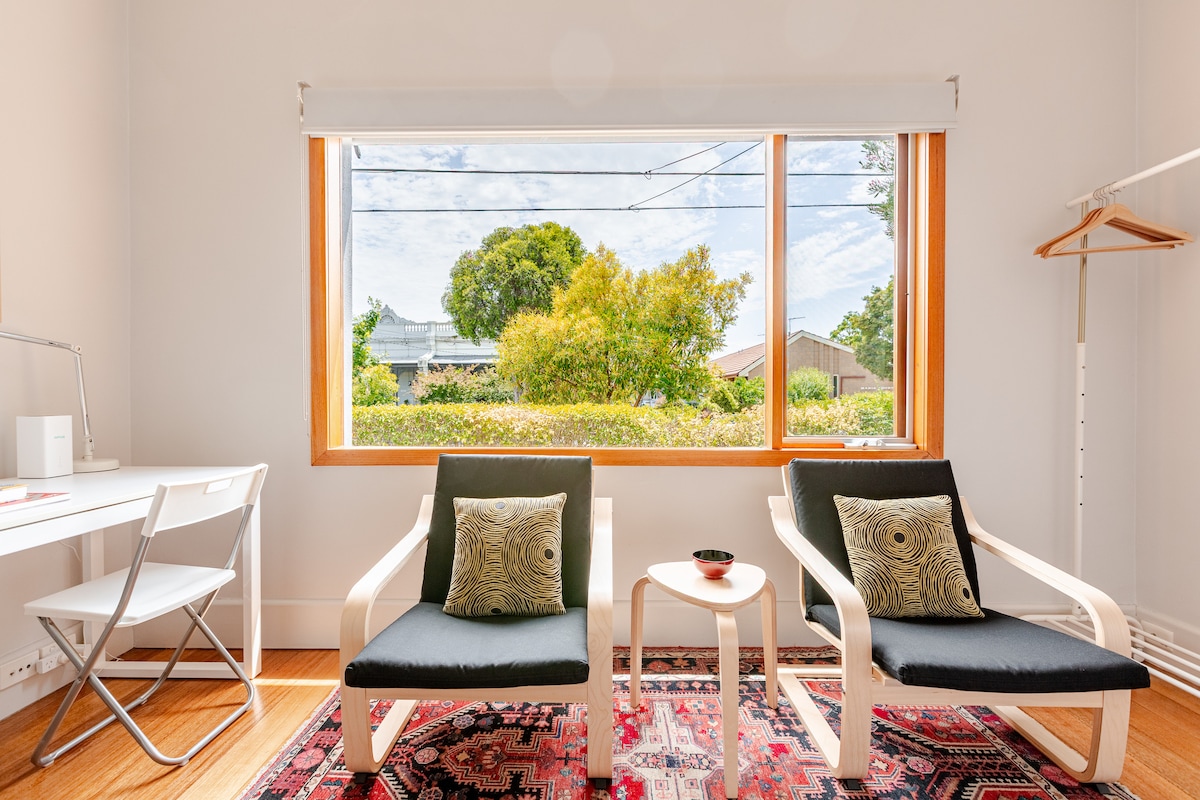 A self contained, quiet, light filled inner city sanctuary with unlimited street parking, a private street entrance and a small sunny garden with seating. A short walk to the station, a five minute train ride Melbourne CBD. Close to popular local cafes and nearby grocery stores. Expansive native parklands with walking paths and running tracks located at the end of the street make a pleasant retreat.Note: kitchenette is set up for basic food prep.