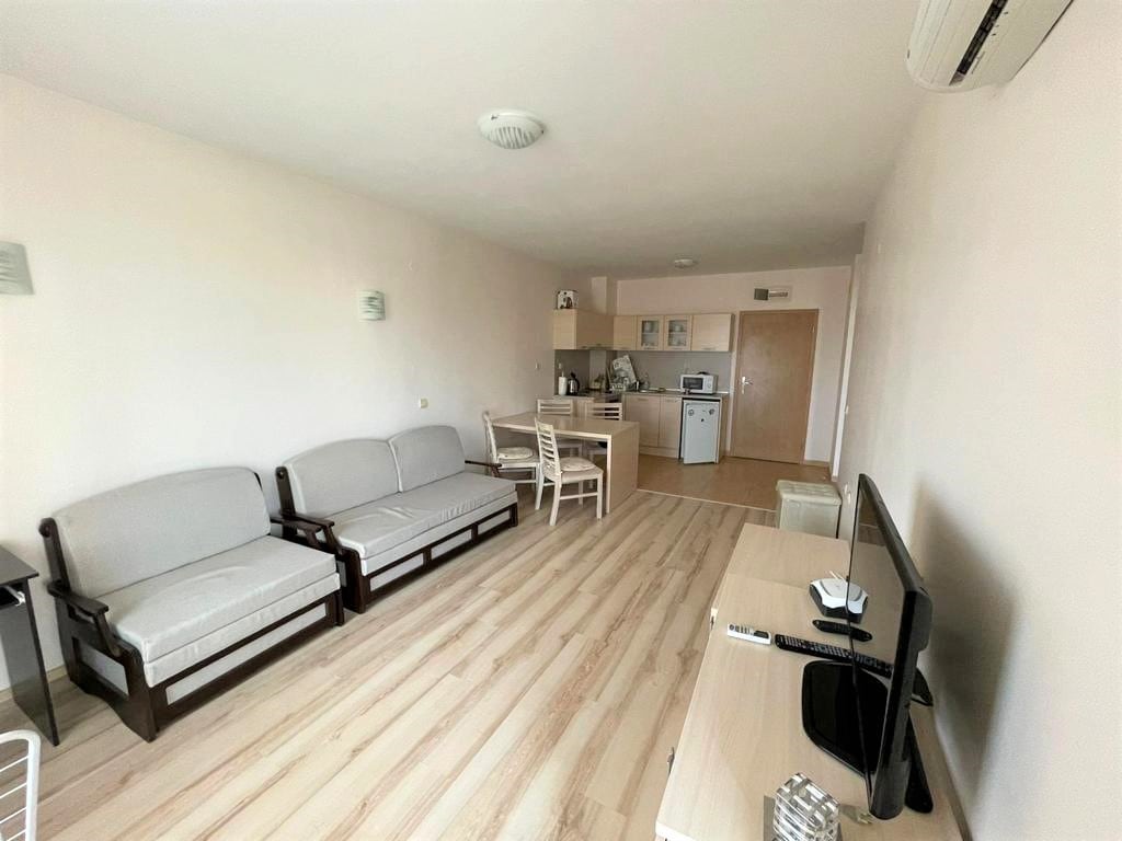 El apartamento se encuentra en el centro vacacional Sunny Beach. La playa está a solo 450 metros. Distrito concurrido, fácil acceso a la calle principal y al centro con todas las comunicaciones y lugares. El popular parque acuático no está lejos. El departamento está totalmente amueblado y equipado, tiene SU PROPIA SALIDA INDEPENDIENTE a la piscina. El territorio está bajo seguridad. La zona del parque está cerca, así como supermercado 24/7, transporte público. Al casco antiguo de Nessebar, a 10 minutos en autobús.