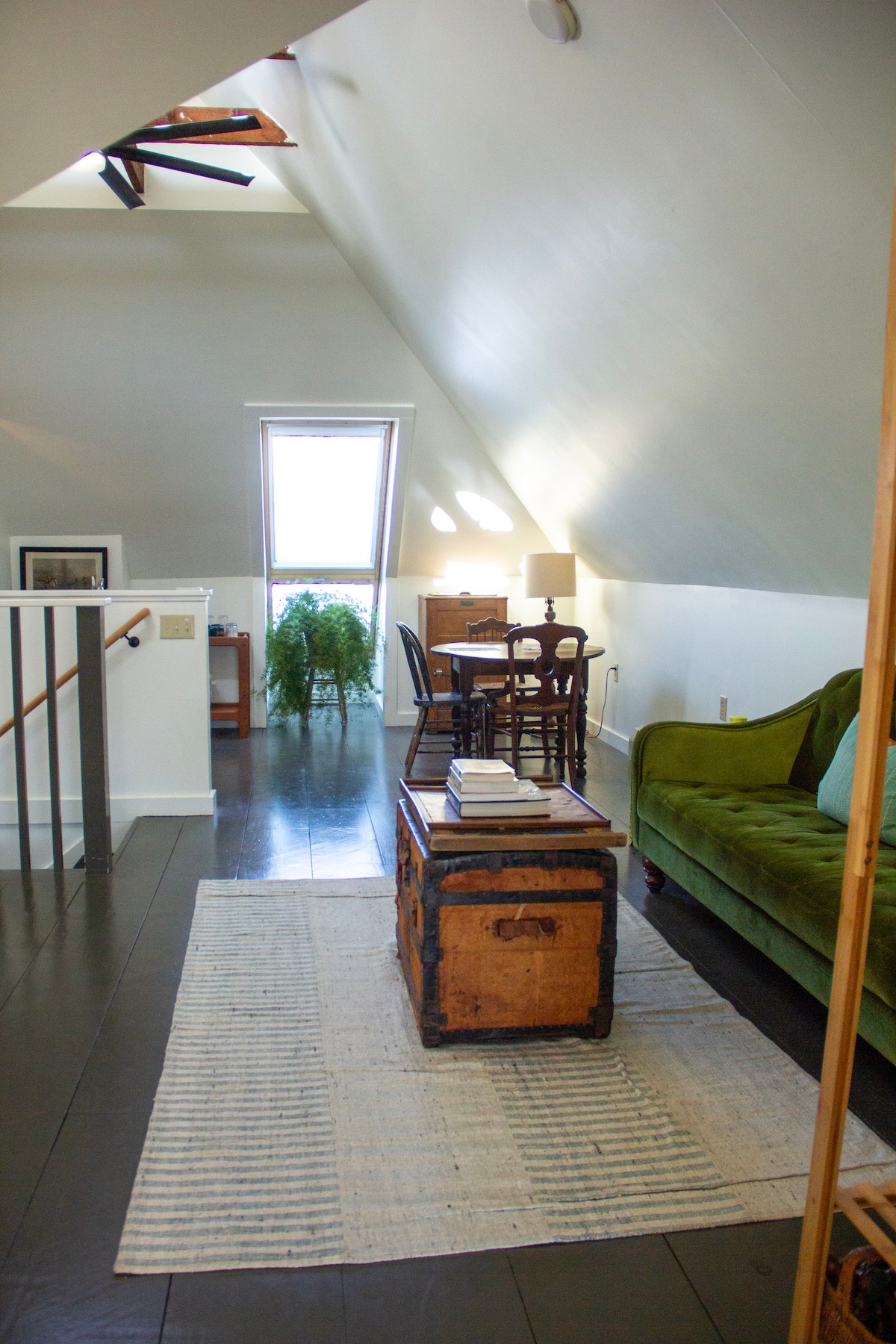 Our spacious tranquil top floor studio is newly renovated and thoughtfully designed. A large space with a luxurious queen bed, sitting and dining areas, as well as a quiet work space. Whether you are here for a weekend getaway, to attend a college event, or in town for work you will find our space fits all your needs. We are perfectly located on the edge of downtown, within minutes walking to Church St, the scenic waterfront, colleges and the hospital. (Note: there is not a full kitchen)