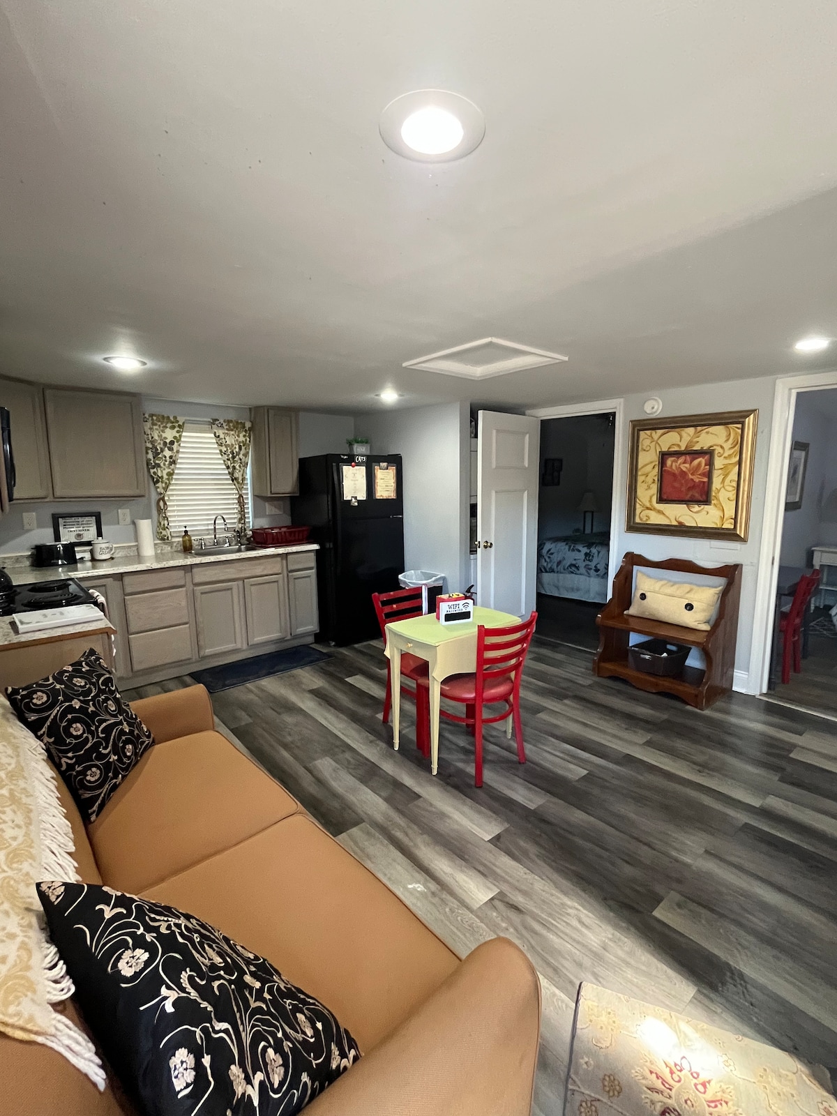 Luminoso y encantador apartamento tipo estudio de 408 pies cuadrados con una cama tamaño queen, escritorio, sillón/otomana, baño privado de 3 piezas y cocina pequeña (fregadero, mininevera y microondas). También incluye un armario dedicado, una estación de café bien surtida, TV inteligente, portaequipajes, tabla de planchar de tamaño completo y secador de pelo. Las ventanas y las puertas francesas ofrecen persianas romanas con paneles opacos para mayor privacidad. El acceso a una zona de estar al aire libre con chimenea también está incluido. Conveniente para las atracciones locales en Aiken, SC y Augusta, GA.