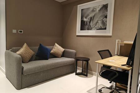 Acogedor y moderno estudio de 1 dormitorio en el corazón de Business Bay. - A solo 5 minutos a pie del centro comercial Dubai Mall y del rascacielos Burj Khalifa. - A 8 minutos de DIFC. - Cerca de los mejores restaurantes y salones a poca distancia a pie. - Servicios gratuitos prémium: piscina y gimnasio. - Aparcamiento gratuito - Servicio de asesoramiento 24 horas, 7 días a la semana. - Wifi de alta velocidad. - Lavandería en el alojamiento. - Cuna para bebés para familias. - Zona apta para patinetes/bicicletas para una fácil exploración. - Entregas de supermercado 24 horas, 7 días a la semana - Vistas al Burj Khalifa desde la sala de fiestas. - Ideal tanto para viajeros de negocios como de placer.