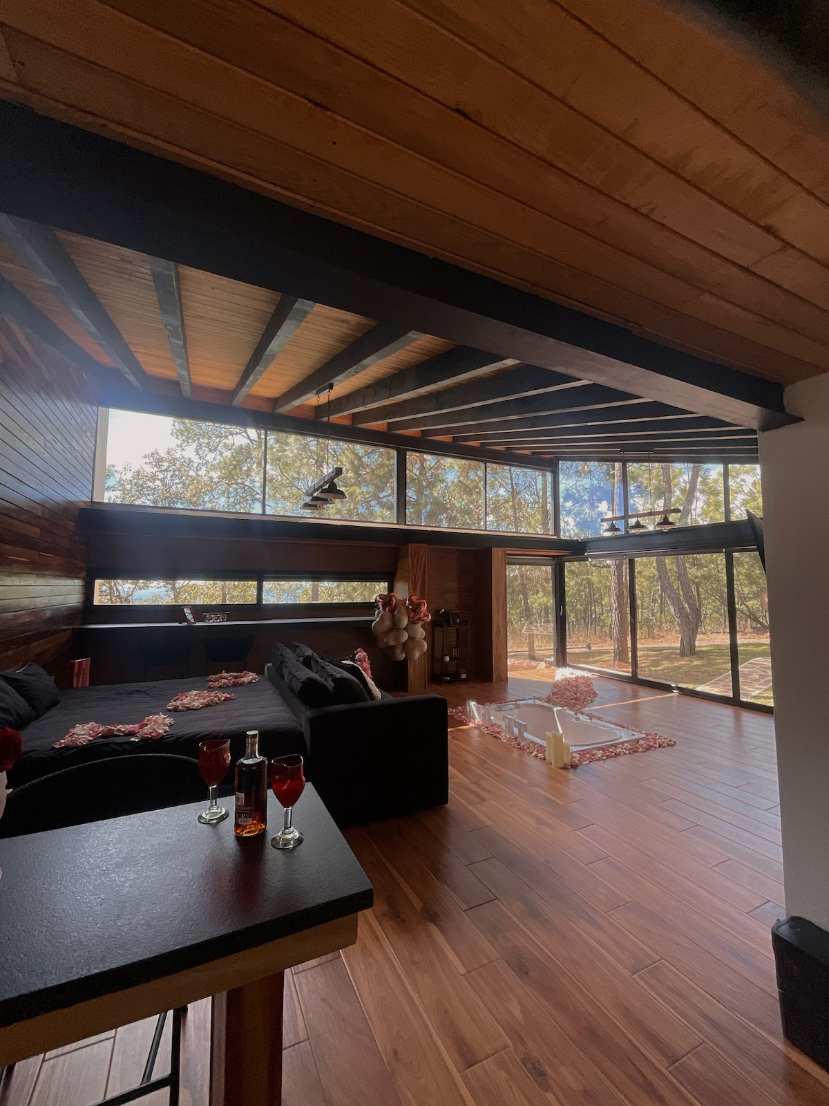 Relájate en este espacio tan tranquilo y elegante, Disfruta del encantador entorno de esta romántica Cabaña Prieta. Se encuentra ubicado a 5 km de la plaza principal, esta rodeada de enormes pinos, cuenta con acabados de lujo, Cocina equipada, Jacuzzi, Terraza con vista Panoramica, TV con sistema Dish. Todo lo necesario para que pases un agradable noche con tu pareja en la naturaleza.